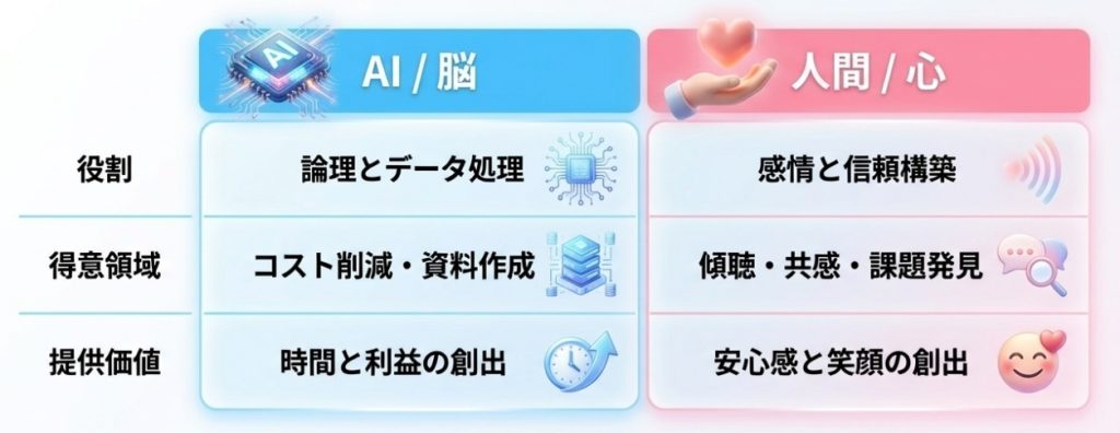 | 教育 期間 | 3〜6ヶ月 (先輩がつきっきりで指導) | 0〜2週間 (AIが完璧な台本と武器を作成) |